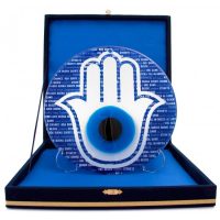 Hand of Mother Fatima evil eye bead wall ornament. Against the backdrop of this glass of evil eye bead, which is produced with fusion glass technique, there are words that mean good luck in all languages.